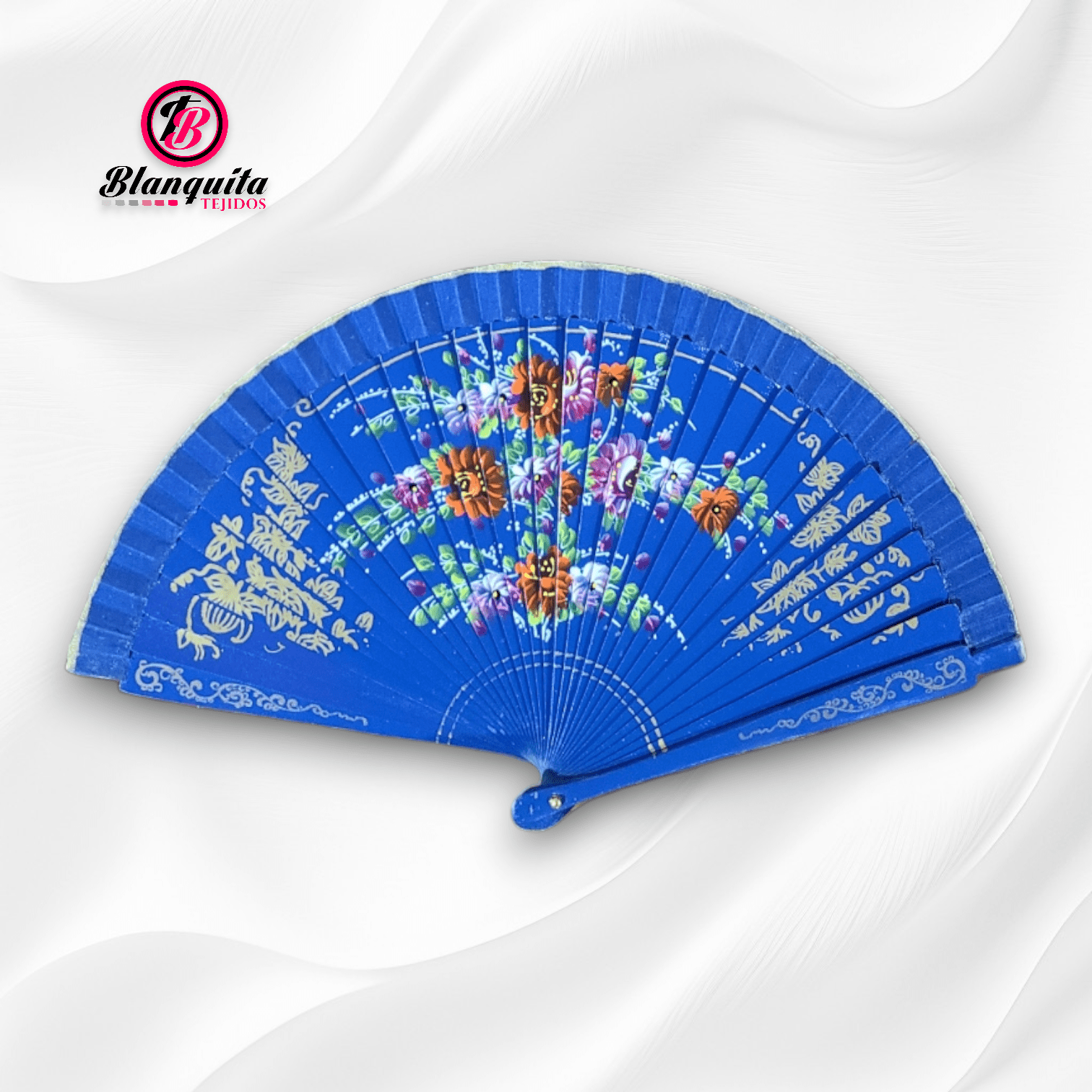 -Abanico elaborado en madera en color azul con imagen de flores