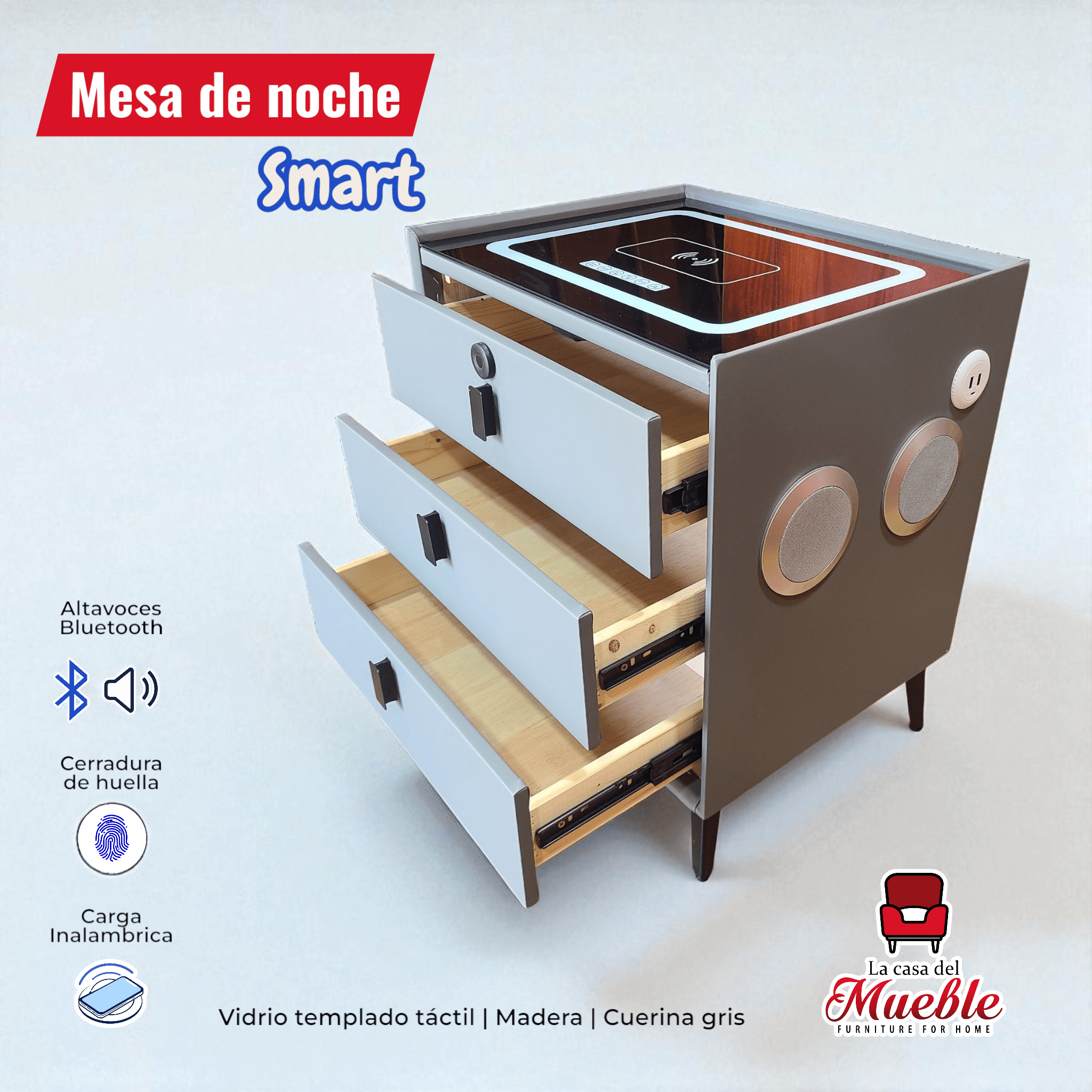 Mesa de noche de lujo en madera en cuerina de microfibra color gris, altavoces Bluetooth, carga inalámbrica y cerradura biométrica. Diseño moderno, funcionalidad inteligente.